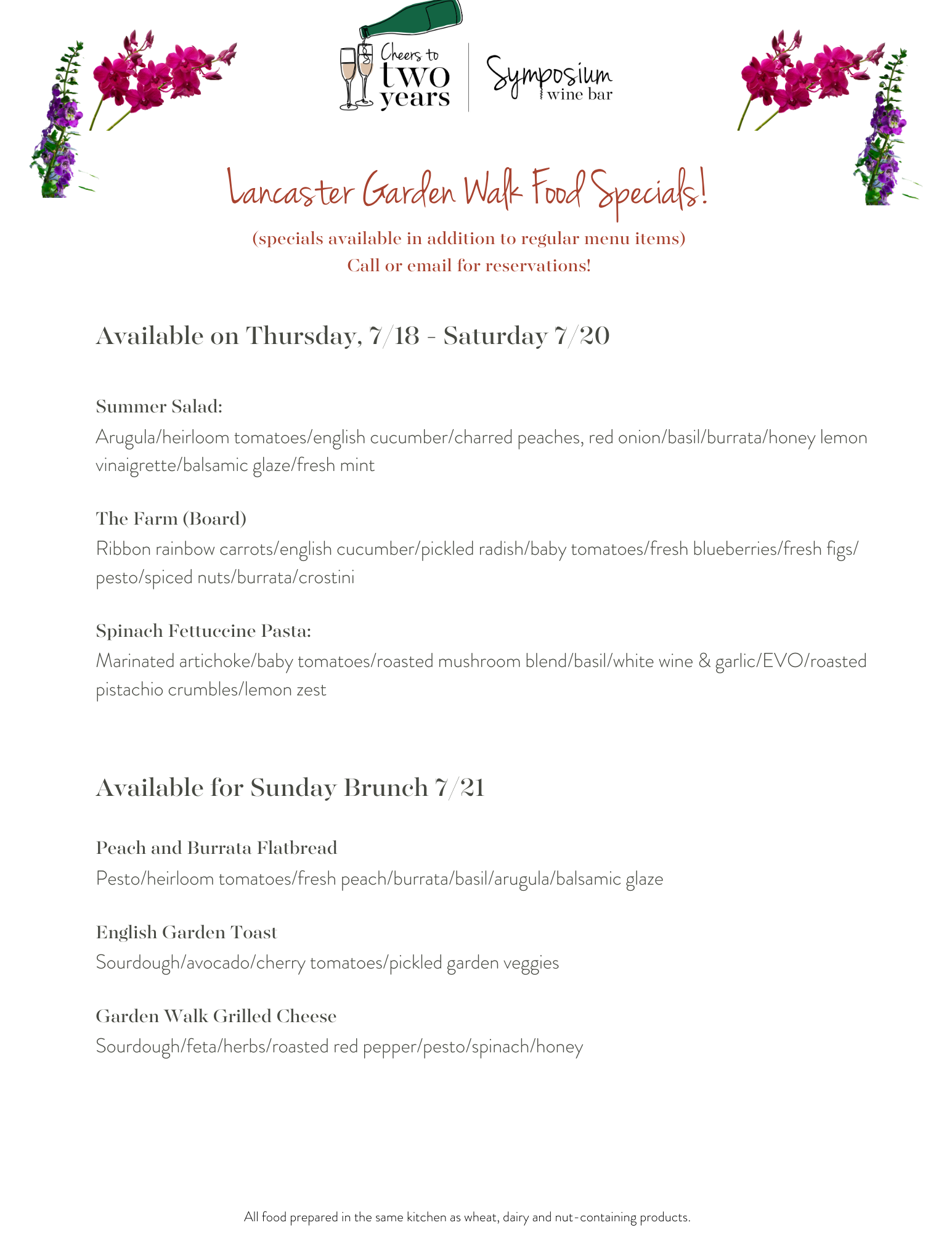 As you plot out your route of meandering through roses, daises and tulips, remember to stop by Symposium for your pre-or post Garden Walk food and drinks! we have lots of fresh, garden-inspired food specials, cocktails, wine and mocktails! Sip on a French 75, Aperol Spritz or refreshing Wine Spritzer - Or maybe a cucumber-Basil mocktail!